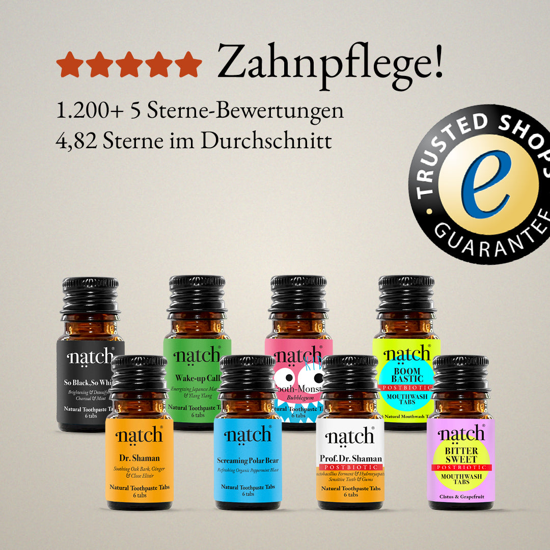 Your new routine for holistic dental health. Our toothpaste formulas, chewable mouthwash tabs, and sustainable toothbrushes combine nature, effectiveness, and design at the highest level. Bold, award-winning, and consistently natural: Natch represents a new era in dental care – for everyone who wants more than just clean teeth.