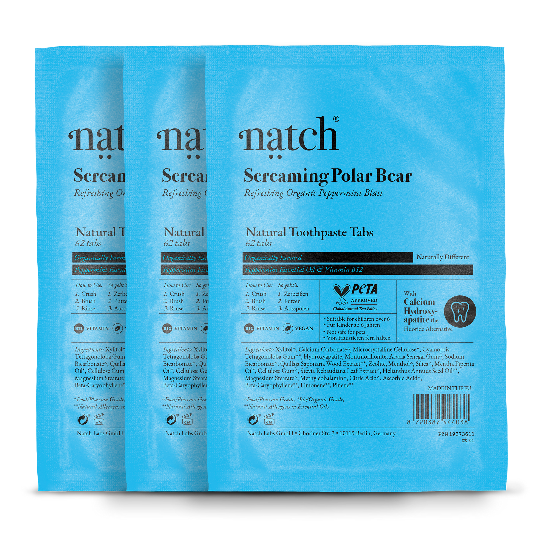 Get get a 3-month supply of tablets delivered in three eco-friendly bags each with 62 tablets (186 in total). For maximum freshness keep the tabs tightly sealed or transfer them to your Natch glass jar with a lid.